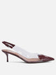 Slingback "Cœur 55 mm" Alaïa utilizza una struttura con suola in cuoio e gomma, associando materiali principali come pelle e poliuretano. Il design è caratterizzato da una silhouette definita da un taglio frontale a forma di cuore, con profilo sottile al tallone e fascia posteriore regolabile. Il tacco kitten conferisce stabilità e supporto, integrato direttamente nella base per una transizione senza soluzione di continuità tra tomaia e suola.