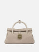 Borsa a mano "Dotta Jones" Zanellato, realizzata in pelle scamosciata e martellata, presenta una costruzione strutturata e silhouette compatta. Il modello è dotato di manici rigidi, chiusura roll-top a calamita, nastrini tubolari con fibbia twist-lock e dettagli a borchie lungo i profili. La parte interna offre una tasca con cerniera e scomparto principale foderato. Tracolla regolabile e rimovibile mediante ganci metallici.