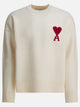 Ami Paris wool "Ami de Coeur" crew-neck sweater made of felted merino wool jersey knit. The uniform weave of the knit gives the garment a compact structure, with a regular silhouette defined by linear seams on the shoulders and sleeves. The crew neck incorporates a ribbed hem, while the inlay work highlights the Ami de Coeur motif positioned on the chest. Elasticized trims at the cuffs and hem complete the construction.