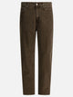 Carhartt WIP velour "Aaron" pants constructed with cotton velour fabric, five-pocket construction and tapered-leg silhouette. Design includes regular waist, back spur, rafter stitching and rivets at major wear points. The closure features a zippered flap. The back pocket is complemented by a square fabric label placed on the side.