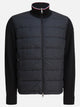 Moncler zippered cotton padded cardigan. Fine gauge 7 shaved knit pattern made of cotton with regular silhouette and lightweight construction. The front features AirSoft down padding, full-length front zipper closure, and zippered side pockets. The collar is finished with tricolor detail, while the brand's logo patch is applied on the sleeve.