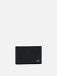 Tom Ford "TF" card holder made of leather. Flat rectangular silhouette structure constructed with finished edges and light stitching. Six card slots divided equally on the two sides. "TF" logo positioned on one of the sides. Minimal proportions and smooth surface with no closures or visible metal elements.