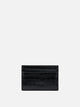 Tom Ford "Exotic Line" card case made of leather with crocodile print and glossy finish. Slim, compact structure features hard surfaces and sharp edges. Construction uses leather cuts juxtaposed with minimal stitching. The Tom Ford logo is embossed on the front. Interior trim includes parallel compartments designed for credit cards or business cards.