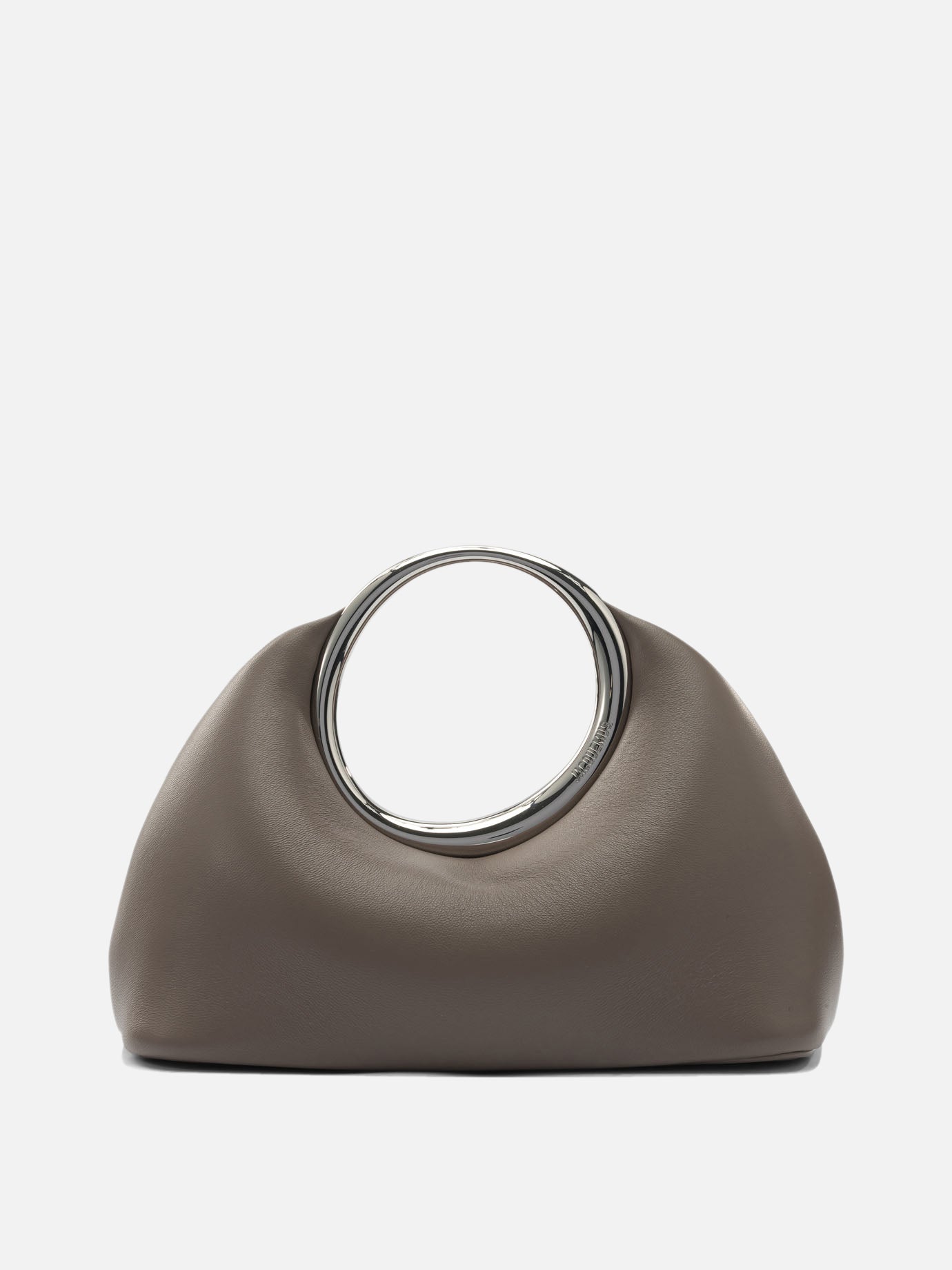 Jacquemus "Calino" clutch bag in nappa leather, with a compact profile and organic shape. The ring handle integrated into the structure is engraved and acts as a carrying element, allowing for a precise grip. The flat base provides stable support, while the magnetic closure offers quick and easy opening. The cotton-lined interior protects the contents and finishes the overall construction.