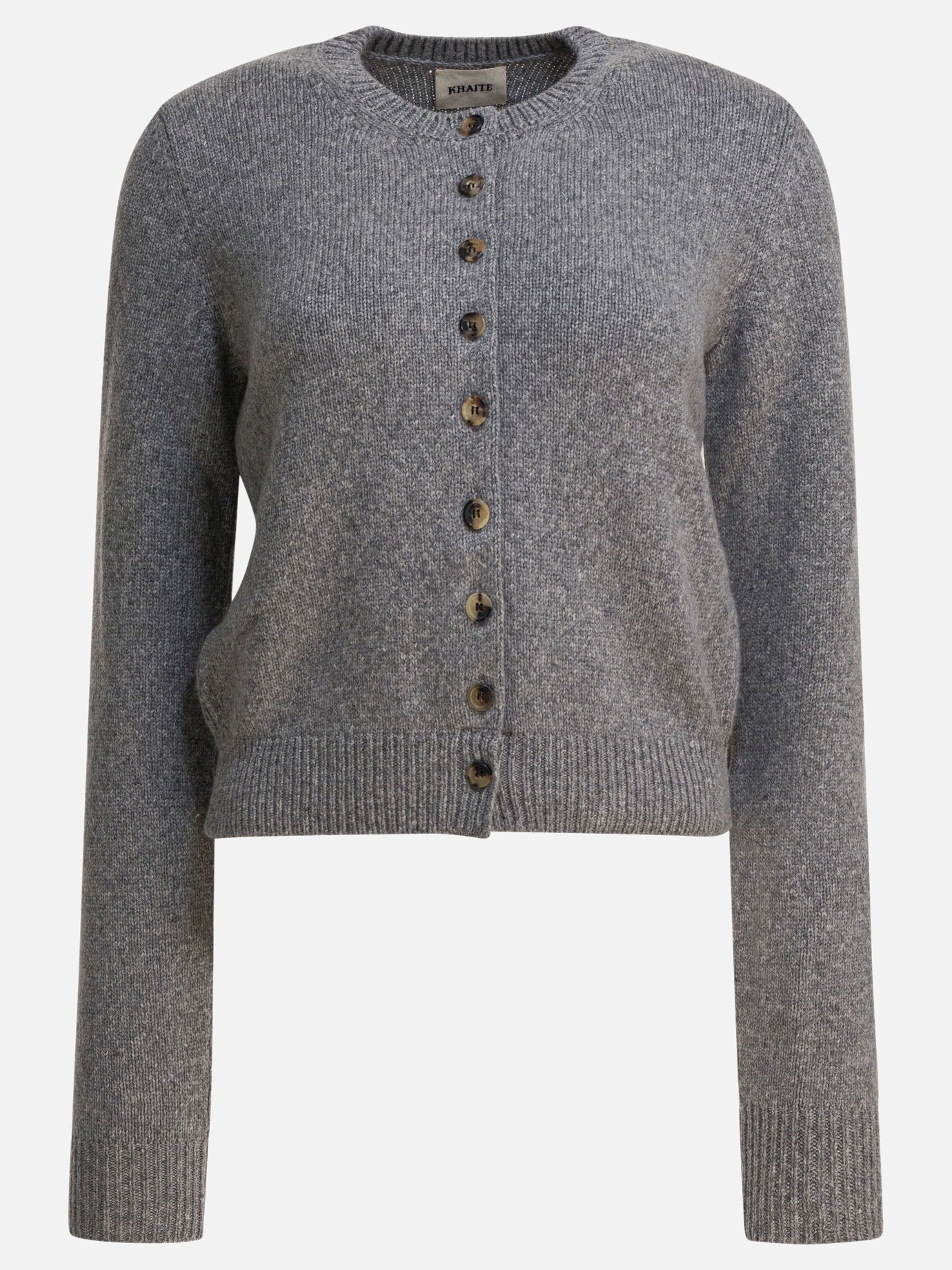 Khaite "Everheart" cardigan made of pure cashmere with a compact knit structure. Features regular construction with slightly cropped silhouette, defined crew neck and ribbed trim on hem and cuffs. Front closure with tortoiseshell buttons. Long sleeves contribute to an essential and functional silhouette, complemented by visible stitching details and clean cut edges.