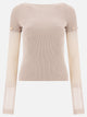 Max Mara Sportmax crew-neck T-shirt in medium-weight stretch viscose, featuring a regular line and fitted structure. The garment features a boat neckline and removable long sleeves, made of transparent viscose, secured by custom buttons. Front stockings draw the bust line. The construction combines a compact knit and functional details designed for modularity and versatility of use.