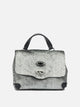 Zanellato's baby "Postina" handbag, constructed of flaky metallic leather, features a compact and rigid structure. The top flap is closed by a double metal swivel clasp with a silver finish. The leather top handle, combined with an adjustable and removable shoulder strap, provides portability and versatility of use. Metal elements finish the sides and base with studs and protective feet, while the trim is tone-on-tone smooth leather.